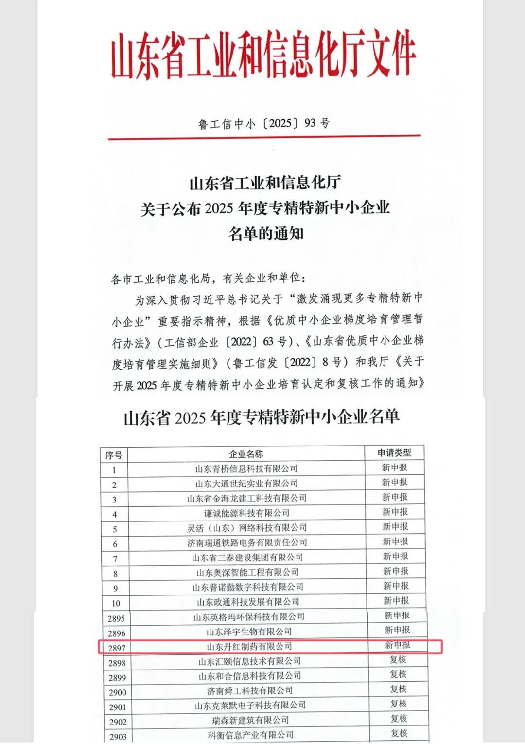 近日,山东省工业和信息化厅公布了《山东省2025年度专精特新中小企业名单》,山东丹红制药有限公司凭借其在所属细分领域的突出表现和强劲的创新实力,成功获评山东省“专精特新”中小企业。此项荣誉是对公司专业化发展、精细化管理和持续创新能力的高度肯定。